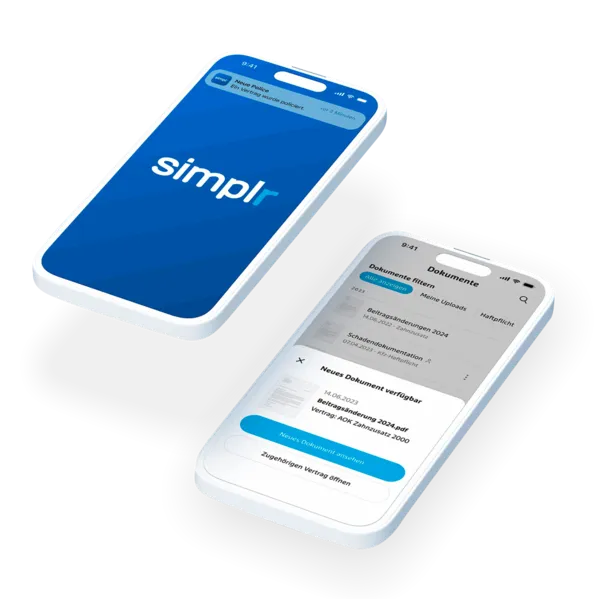 Adieu Papierkram! Mit der kostenlosen simplr-App hast Du all Deine Versicherungen jederzeit im Blick – digital, übersichtlich, aktuell und an einem Ort. Prüfe und vergleiche Deine Verträge online, melde Schäden oder aktualisiere Deine persönlichen Daten mit nur wenigen Klicks. Einfach, schnell und jederzeit intuitiv!